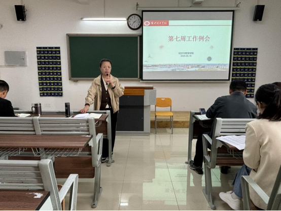 2024年4月10日下午,九游体育官方网站在一教213召开九游体育官方网站第七周工作例会,院长吴玲主持会议,副院长秦品德、院长助理张珊以及全体教师参会。