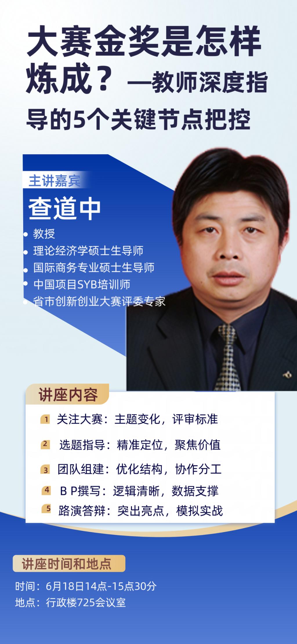 【学术讲座】--大赛金奖是怎样炼成?一教师深度指导的5个关键节点把控--主讲嘉宾查道中教授