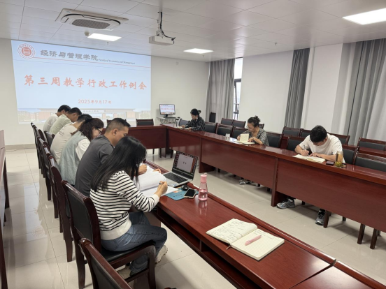 2025 年 9 月 17 日上午,九游体育官方网站在行政楼 725 会议室召开第三周教学行政工作例会。院长吴玲主持会议,院长助理张珊、叶赵强,教学秘书李健,各教研室主任及相关行政人员参会。