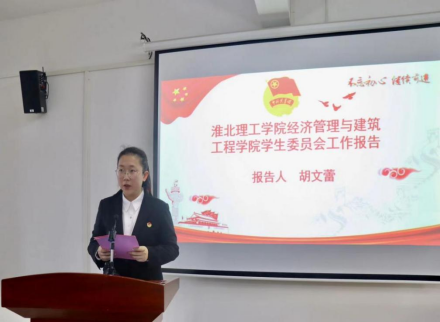 校团委书记刘帅克代表学校向大会的召开表示热烈祝贺,向全体团学代表致以亲切的问候。他高度赞扬了经济管理与建筑工程学院团总支一年来的工作成绩,同时对学生代表提出三点希望:一、广大青年要好好学习,努力工作,拼搏奋斗,争做实现中华民族伟大复兴的主力军;二、要坚定理想信念,把握正确方向,成长为有理想、敢担当、能吃苦、肯奋斗的新时代好青年;三、要刻苦学习进步,多读书、读好书,学理论、学文化、学科学、学技能。肩负使命,共同谱写淮北理工学院共青团工作的新篇章!
