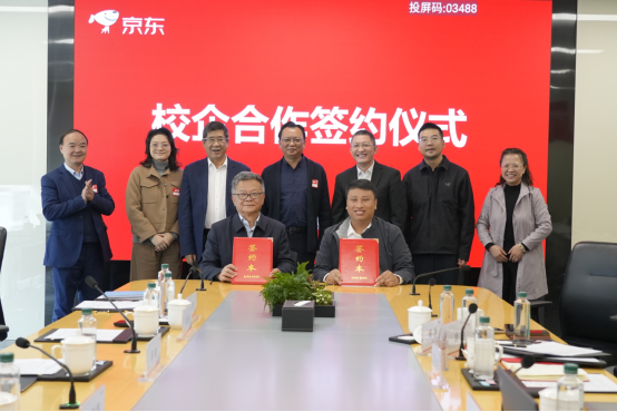 在全体与会人员的共同见证下,淮北理工学院校长杨兵与京东代表乔治签署“淮北理工学院&京东数智产业学院合作共建协议”。
