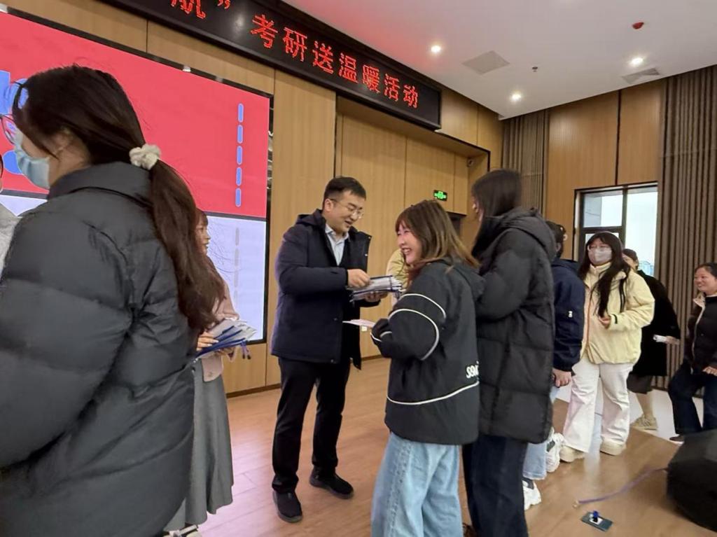 随后,辅导员老师们亲手将内含考试专用笔、涂卡铅笔、橡皮等实用文具的“考研加油包”逐一送到每一位学子手中,发放过程中还与学生亲切交流,耐心解答备考疑问、悉心疏导心理压力。老师们温柔的叮嘱与鼓励,如冬日里的暖阳,驱散了备考的疲惫与焦虑,让学子们感受到了学院无微不至的关怀。