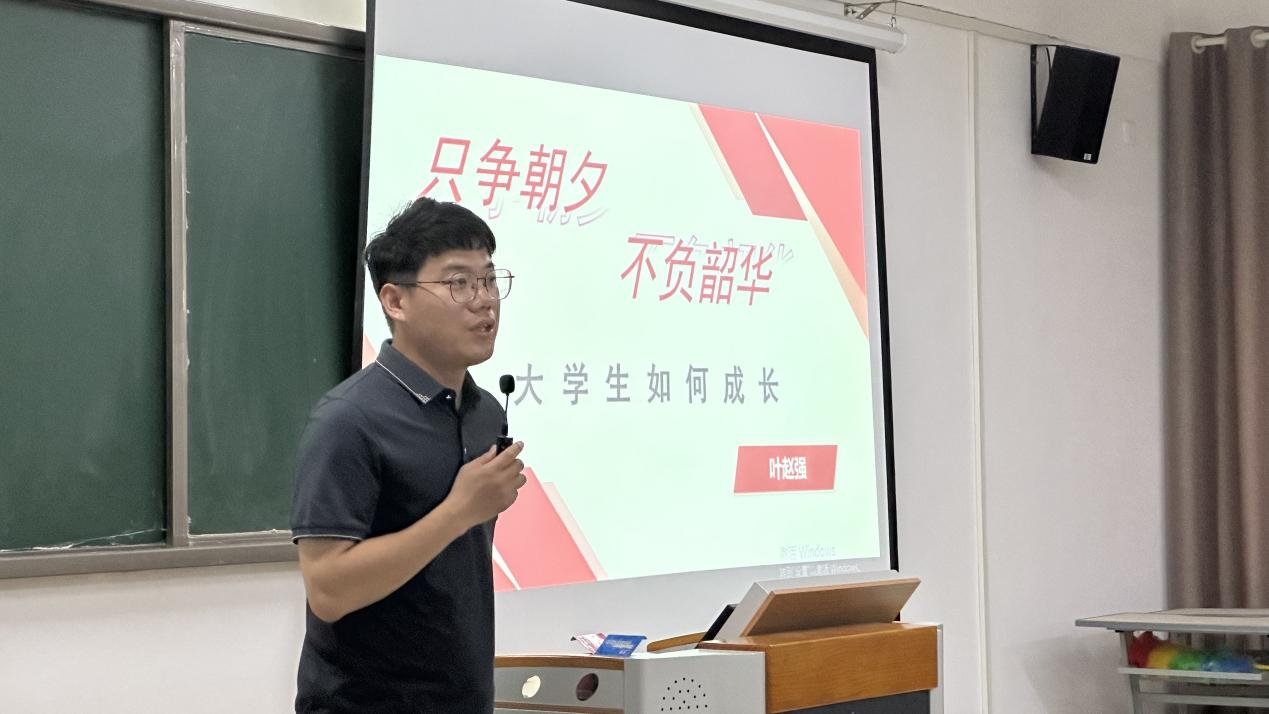 “说成长”:由学院书记助理叶赵强老师向新生介绍大学生在校如何成长,叶老师提出成长三问并作出解释:一、成长是终身过程,不仅仅是身体年龄的增长,更是思想、智慧、责任感的提升,包括对自己和他人的认知以及应对生活挑战的能力。二、成长的标准多元,包括知识水平、人际关系、社会责任感等,积极心态、适应能力、创新思维也是重要指标。三、成长需要积极参与、主动学习、拥抱变化。最后叶赵强老师鼓励新生们积极参与学术与社会活动,勇敢面对挑战,为全面成长奠定坚实基础。