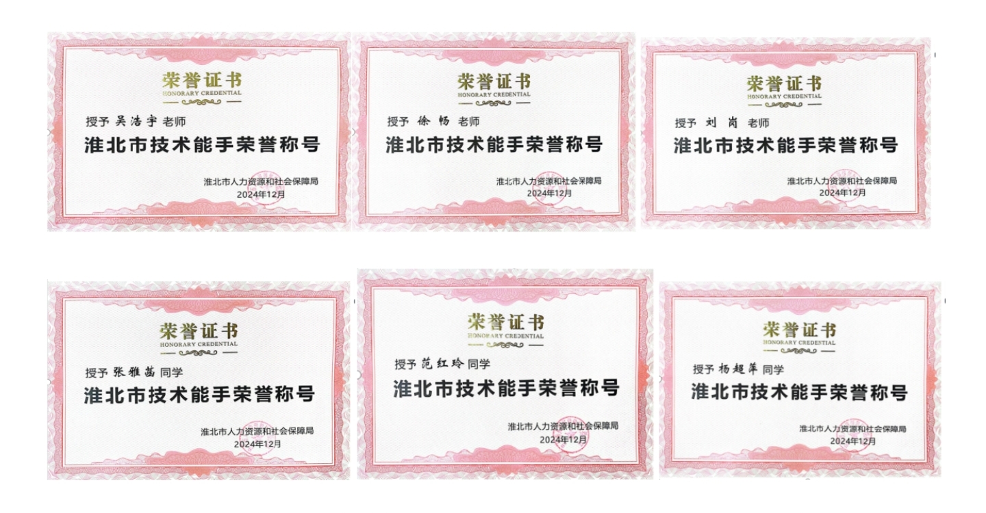 近日,经淮北市人力资源和社会保障局认定,九游官网教师吴浩宇、徐畅、刘岗,学生张雅菡、范红玲、杨超萍6名师生荣获“淮北市技术能手”荣誉称号。他们凭借扎实的专业素养和优异的实战能力,成功获此殊荣,为学校赢得了崇高荣誉,充分展现了九游官网在技能人才培养方面的显著成效。