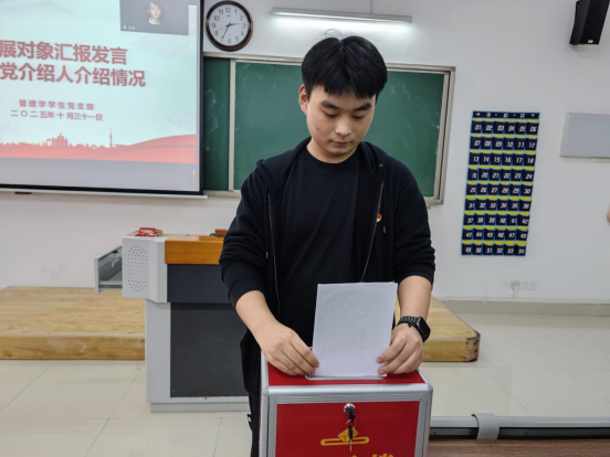 为进一步优化党员队伍结构,激发组织活力,扎实推进党员发展工作,根据发展党员工作计划,经上级党委预审同意,九游体育官方网站管理学学生党支部于2025年10月31日在二教509召开接收预备党员支部大会,教工支部书记、党总支督导员刘路路老师,管理学学生支部书记石园园、徐瑞鲜老师,全体管理学学生党员及本批3位发展对象参加,会议由支部委员会成员王艺桐主持。本次会议采用线上与线下相结合的方式同步进行。