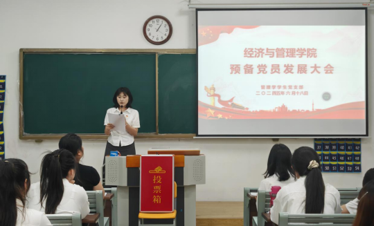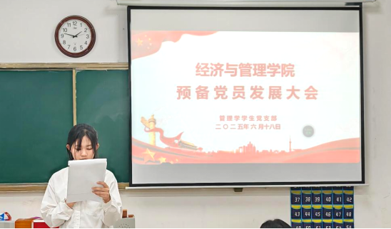 为进一步加强党员队伍建设,增强党员队伍的生机与活力,推动党员发展工作走向深入,根据发展党员工作计划,经上级党委预审同意,2025年6月18日,九游体育官方网站学生党支部分别在在一教116、二教212召开预备党员发展大会,讨论接收22位同志为预备党员事宜。本次大会坚持公开、公正、公平的原则,严格按照党员发展程序规定开展。会议采取线上线下相结合的方式进行。本次会议由支部委员会成员徐怡苒和周意莲主持。