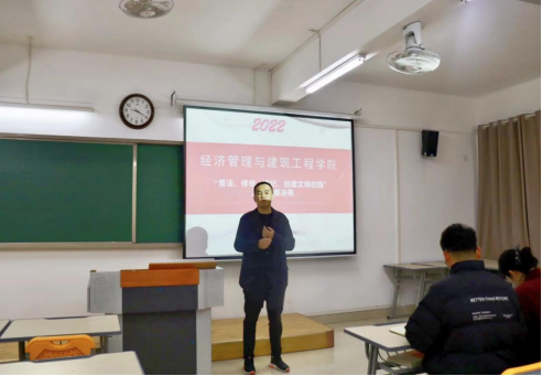 为增强学生法律知识,营造文明和谐的校园氛围,响应学校《关于开展“普法、修徳、遵纪、创建文明校园”专项活动》的文件精神,深入学习习近平法治思想,引导学生深入了解宪法、尊重宪法精神,于2022年11月15日晚七点,在二教323室举行经济管理与建筑工程学院“普法、修徳、遵纪、创建文明校园”演讲比赛。马克思主义学院院长助理陈志操、经济管理与建筑工程学院教工支部书记刘路路、经济管理与建筑工程学院书记助理叶赵强担任本场比赛评委老师,比赛由院学生会宣传部部长韩大壮主持。