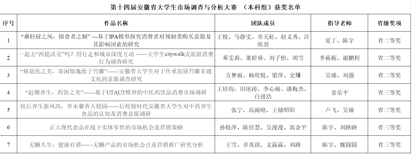 2024年4月,由安徽省教育厅主办的第十四届安徽省大学生市场调查与分析大赛(本科组、B类赛事)于安徽财经大学落下帷幕。通过知识赛、实践赛校赛、实践赛省赛等层层选拔,九游官网晋级省赛的7支队伍,分别获得省级二等奖3项、省级三等奖4项。