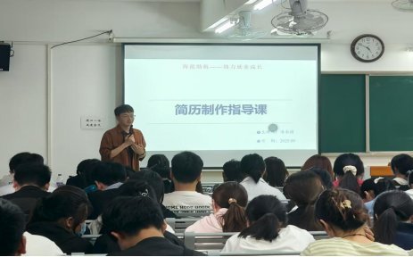 下午,潘永强经理在2教322开展专场简历指导讲座,学院2026届毕业生代表近200人参与。