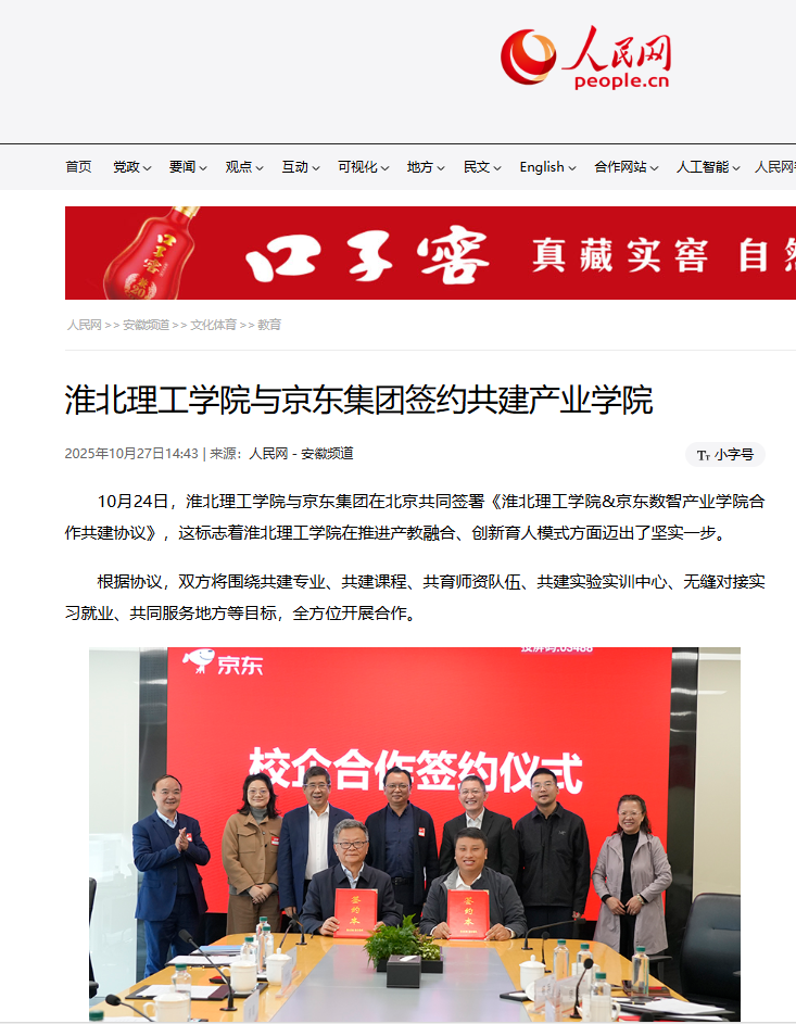 10月24日,淮北理工学院与京东集团在北京共同签署《淮北理工学院&京东数智产业学院合作共建协议》,这标志着淮北理工学院在推进产教融合、创新育人模式方面迈出了坚实一步。对此,人民网进行了报道:
