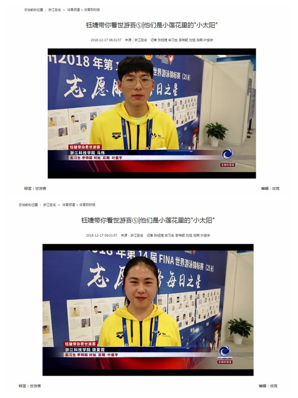 12月11-16日,第14届FINA世界游泳锦标赛(25米)在杭州举行,bat365世游赛志愿者在岗服务期间,他们勇于担当、乐于奉献,用智慧和汗水践行了“奉献、友爱、互助、进步”的志愿者精神。服务期间,浙江在线对bat365志愿者进行报道。