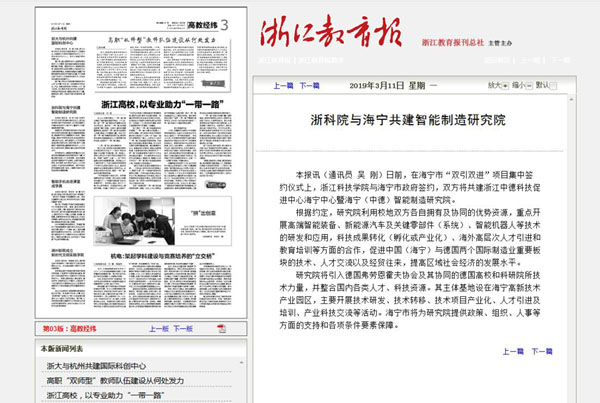 日前,在海宁市“双引双进”项目集中签约仪式上,浙江科技学院与海宁市政府签约,双方将共建浙江中德科技促进中心海宁中心暨海宁(中德)智能制造研究院。