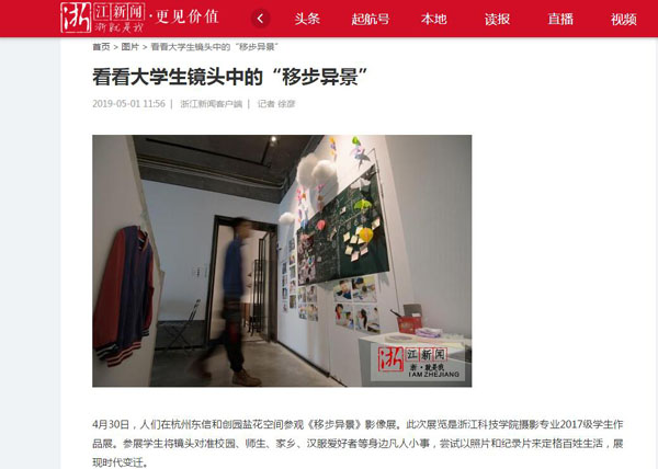 4月30日,人们在杭州东信和创园盐花空间参观《移步异景》影像展。此次展览是浙江科技学院摄影专业2017级学生作品展。参展学生将镜头对准校园、师生、家乡、汉服爱好者等身边凡人小事,尝试以照片和纪录片来定格百姓生活,展现时代变迁。
