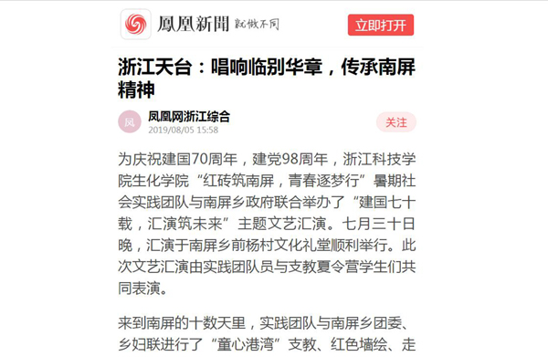 为庆祝建国70周年,建党98周年,浙江科技学院生化学院“红砖筑南屏,青春逐梦行”暑期社会实践团队与南屏乡政府联合举办了“建国七十载,汇演筑未来”主题文艺汇演。七月三十日晚,汇演于南屏乡前杨村文化礼堂顺利举行。此次文艺汇演由实践团队员与支教夏令营学生们共同表演。