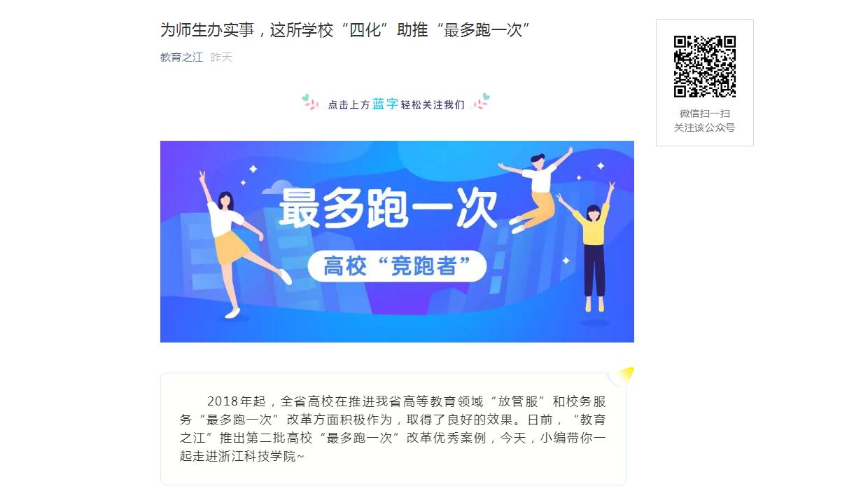 2018年起,全省高校在推进我省高等教育领域“放管服”和校务服务“最多跑一次”改革方面积极作为,取得了良好的效果。日前,“教育之江”推出第二批高校“最多跑一次”改革优秀案例,今天,小编带你一起走进浙江科技学院~