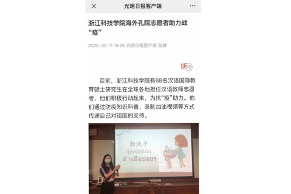 目前,浙江科技学院有68名汉语国际教育硕士研究生在全球各地担任汉语教师志愿者,他们积极行动起来,为抗“疫”助力。他们通过防疫知识科普、录制加油视频等方式传递自己对祖国的支持。