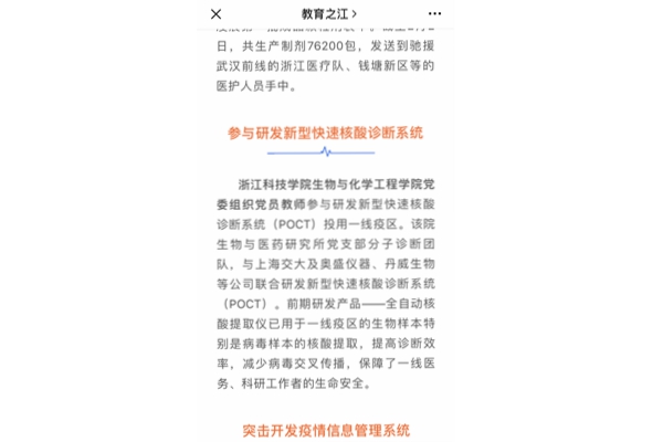 浙江科技学院生物与化学工程学院党委组织党员教师参与研发新型快速核酸诊断系统(POCT)投用一线疫区。该院生物与医药研究所党支部分子诊断团队,与上海交大及奥盛仪器、丹威生物等公司联合研发新型快速核酸诊断系统(POCT)。前期研发产品——全自动核酸提取仪已用于一线疫区的生物样本特别是病毒样本的核酸提取,提高诊断效率,减少病毒交叉传播,保障了一线医务、科研工作者的生命安全。