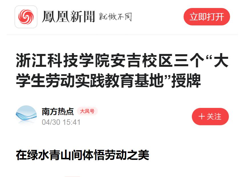 凤凰新闻:浙江科技学院安吉校区三个“大学生劳动实践教育基地”授牌