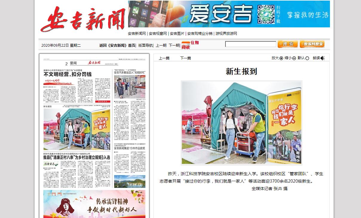 昨天,浙江科技学院安吉校区陆续迎来新生入学。该校组织校区“管家团队”、学生志愿者开展“接过你的行李,我们就是一家人”等活动喜迎3700余名2020级新生。