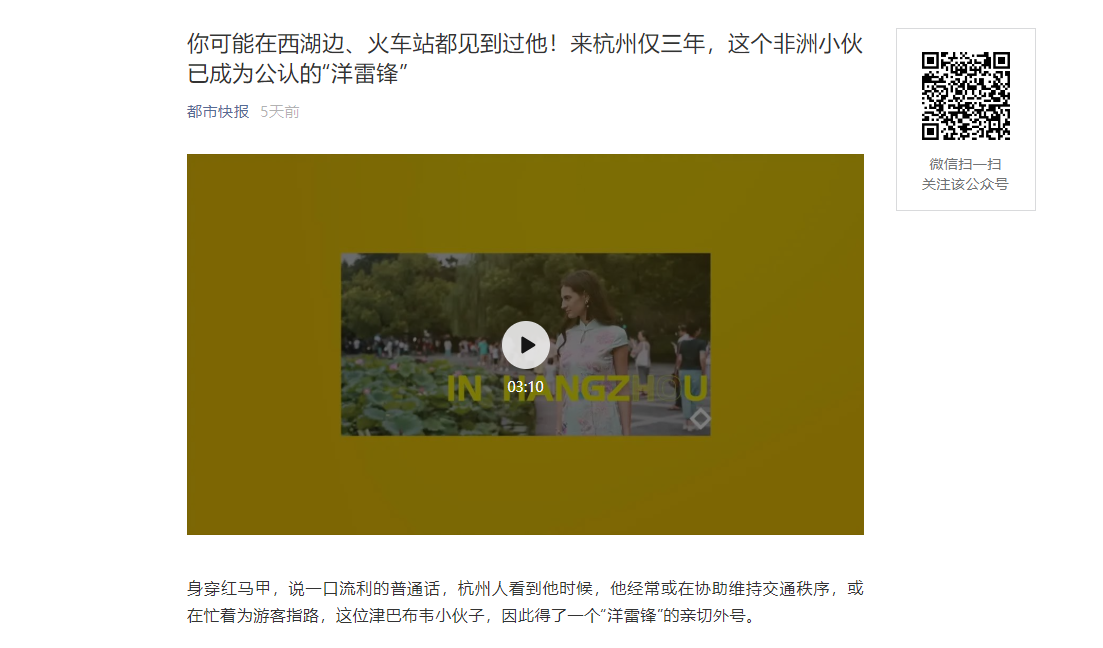 原文链接:你可能在西湖边、火车站都见到过他!来杭州仅三年,这个非洲小伙已成为公认的“洋雷锋”