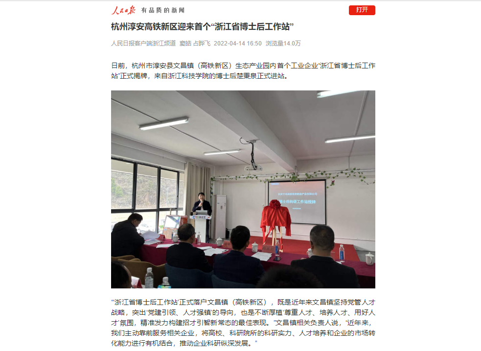 日前,杭州市淳安县文昌镇(高铁新区)生态产业园内首个工业企业“浙江省博士后工作站”正式揭牌,来自浙江科技学院的博士后楚秉泉正式进站。