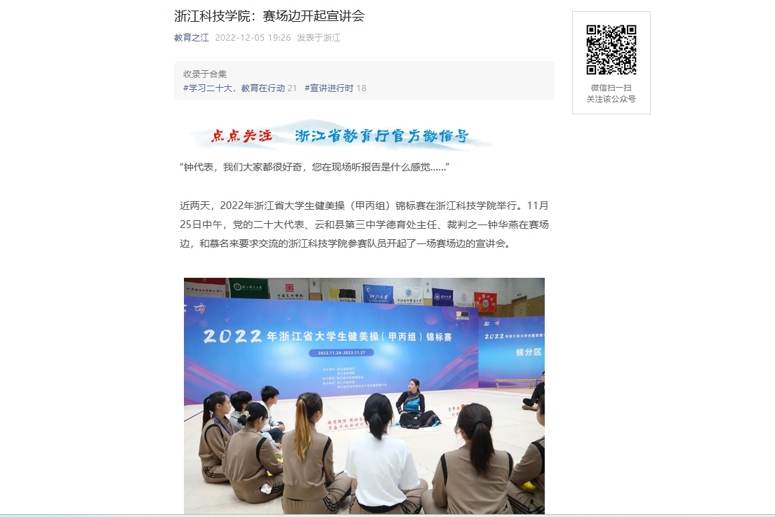 近期,学校党委高度重视党的二十大精神学习宣讲,面向广大师生组织开展形式多样的宣讲活动,让党的二十大精神走进学生心间。教育之江、小时新闻等媒体关注党的二十大代表、云和县第三中学德育处主任、裁判之一钟华燕在赛场边,和学校青年学子进行赛场边的宣讲会。