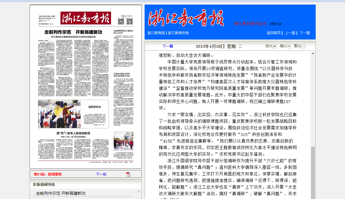 浙江外国语学院将中层干部分组调研作为提升干部“六识七能”的有效手段,提倡研究“真问题”;温州医科大学倡导深入基层一线,多到困难多、师生意见集中、工作打不开局面的地方和单位,体察实情、解剖麻雀,把问题研究透彻、把措施提准提实,确保调研“沉得下、研得深、能转化、能解题”;浙江工业大学也在“真研”上下功夫,深入开展“大走访大调研大服务大解题”活动,搞好“真调研”、破解“真问题”、务求“真成效”……