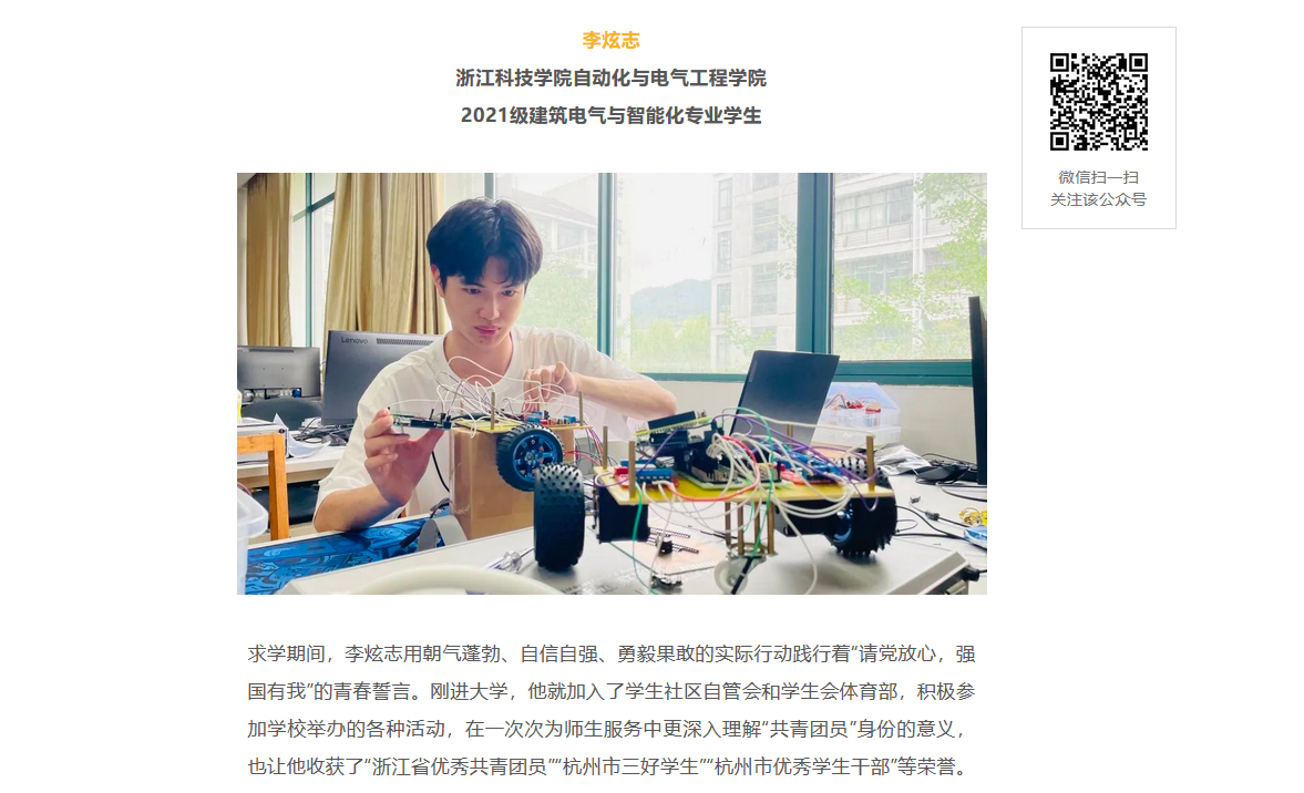 2021级建筑电气与智能化专业学生求学期间,李炫志用朝气蓬勃、自信自强、勇毅果敢的实际行动践行着“请党放心,强国有我”的青春誓言。刚进大学,他就加入了学生社区自管会和学生会体育部,积极参加学校举办的各种活动,在一次次为师生服务中更深入理解“共青团员”身份的意义,也让他收获了“浙江省优秀共青团员”“杭州市三好学生”“杭州市优秀学生干部”等荣誉。课余时间,他也积极投身各类志愿活动:成为杭州市亚运赛会志愿者、参加敬老助老服务活动……用实际行动诠释新时代志愿者的奉献精神和职责使命。