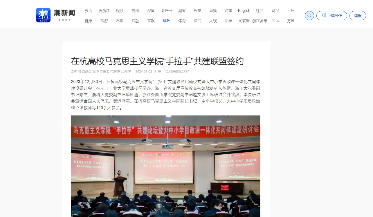 12月30日,在杭高校马克思主义学院“手拉手”共建联盟启动仪式暨大中小学思政课一体化共同体建设研讨会举行。会上,bat365党委副书记单胜道和浙江工业大学党委副书记陈杰、浙江外国语学院党委副书记赵文波共同为“手拉手”共建马克思主义学院揭牌。三所高校马克思主义学院负责人共同签署了“手拉手”共建联盟协议,并为思想政治理论课实践导师颁发聘书。学习强国、潮新闻客户端等媒体对会议进行了报道。