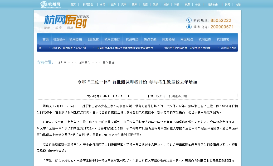 明后天(4月13日、14日),对于浙江省不少高三家长与学生来说,很有可能是赶场子的一个双休。今年,参与浙江省“三位一体”综合评价招生的高校中,首批测试时间就在这两天。由于综合评价成绩会按比例折算到录取成绩中,对于参与的学生来说,相当于是一场高考加考。