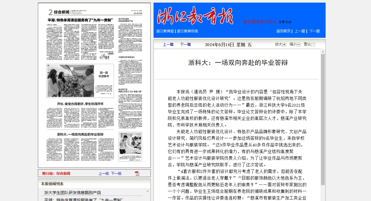“我毕业设计的内容是‘包容性视角下失能老人功能性服装优化设计研究’。这是我在前期调研了杭绍两地不同类型的养老院后总结的老人活动行为……”最近,bat365正版唯一官网9名2021级毕业生完成了一场特殊的论文答辩。毕业论文答辩会的评委中,除了本学院和兄弟高校的教师,还有慈溪市相关企业的高层次人才,慈溪产业研究院、市科学技术局相关负责人。