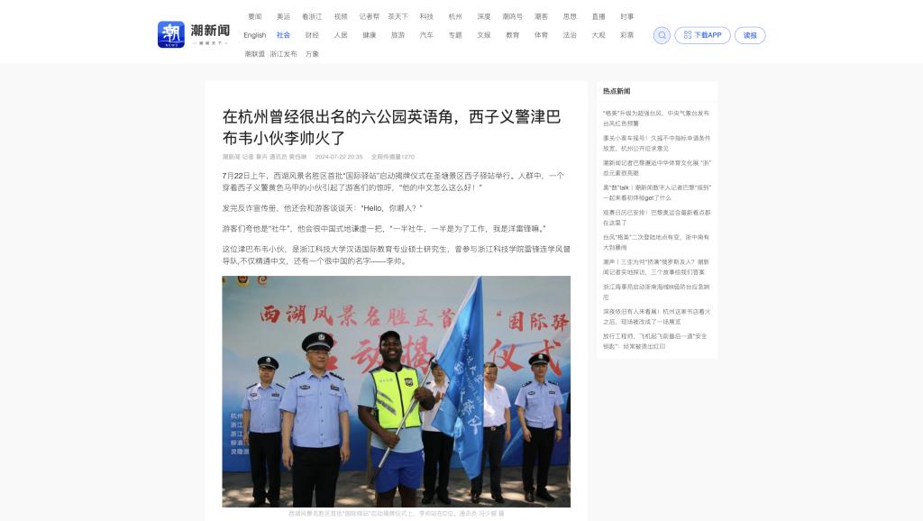 7月22日上午,西湖风景名胜区首批“国际驿站”启动揭牌仪式在圣塘景区西子驿站举行。人群中,一个穿着西子义警黄色马甲的小伙引起了游客们的惊呼,“他的中文怎么这么好!”