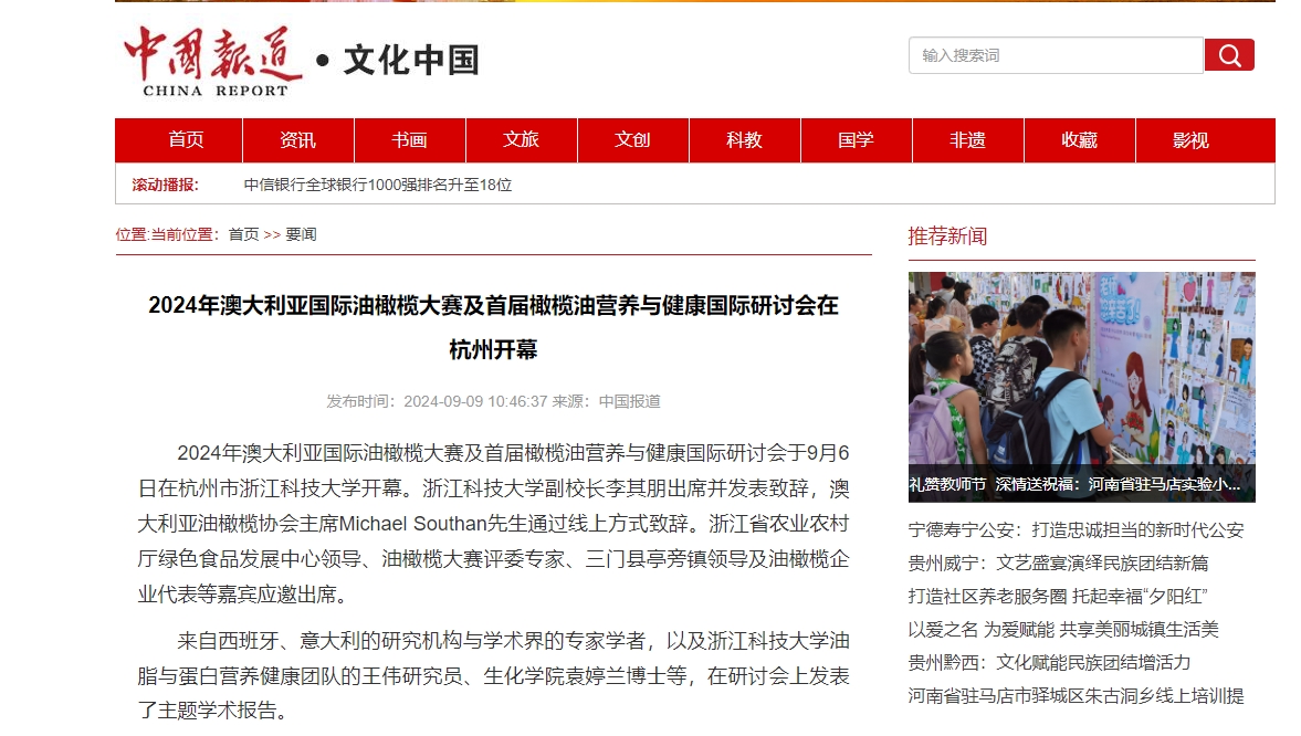 中国报道网:2024年澳大利亚国际油橄榄大赛及首届橄榄油营养与健康国际研讨会在杭州开幕