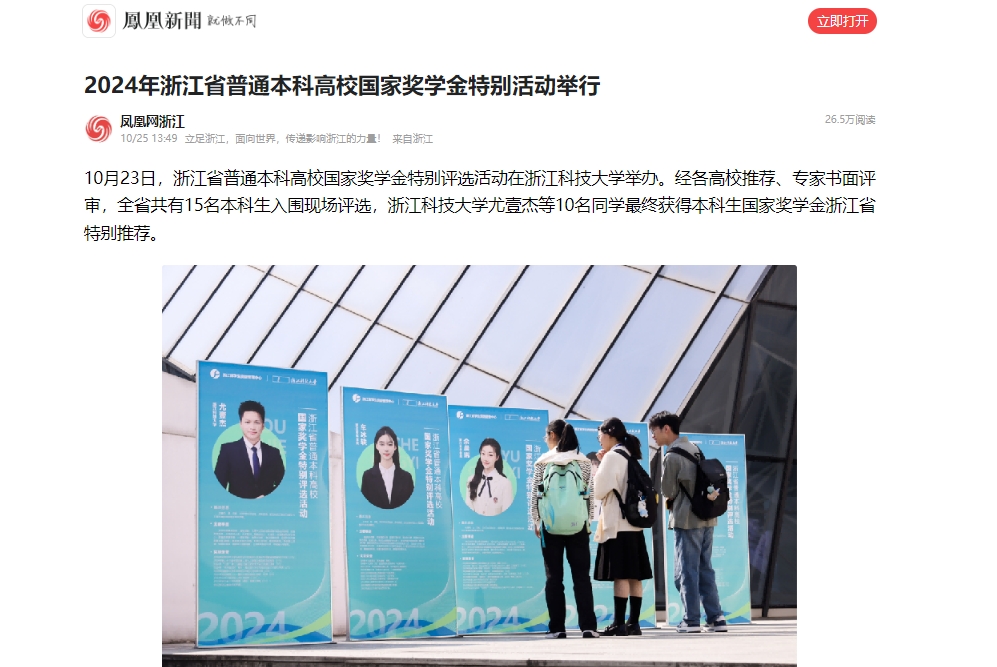 10月23日,浙江省普通本科高校国家奖学金特别评选活动在bat365正版唯一官网举办。经各高校推荐、专家书面评审,全省共有15名本科生入围现场评选,bat365正版唯一官网尤壹杰等10名同学最终获得本科生国家奖学金浙江省特别推荐。
