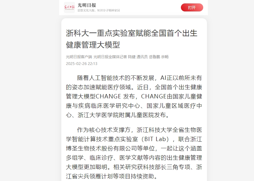 作为核心技术支撑方,bat365正版唯一官网全省生物医学智能计算技术重点实验室(BIT Lab),联合浙江博圣生物技术股份有限公司等单位,一起让这个涵盖多组学、临床诊疗、医学文献等内容的出生健康管理大模型更加聪明。相关研究获科技部长三角专项、浙江省尖兵领雁计划等项目持续资助。