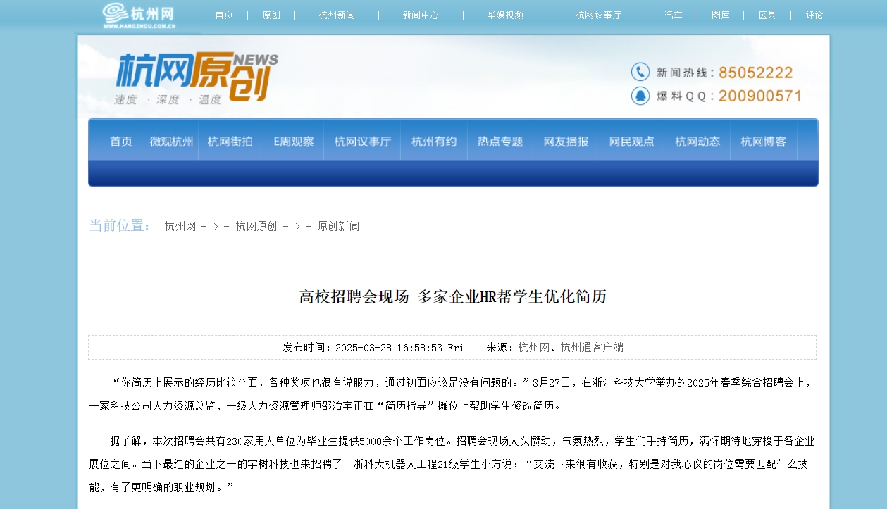据了解,本次招聘会共有230家用人单位为毕业生提供5000余个工作岗位。招聘会现场人头攒动,气氛热烈,学生们手持简历,满怀期待地穿梭于各企业展位之间。当下最红的企业之一的宇树科技也来招聘了。浙科大机器人工程21级学生小方说:“交流下来很有收获,特别是对我心仪的岗位需要匹配什么技能,有了更明确的职业规划。”