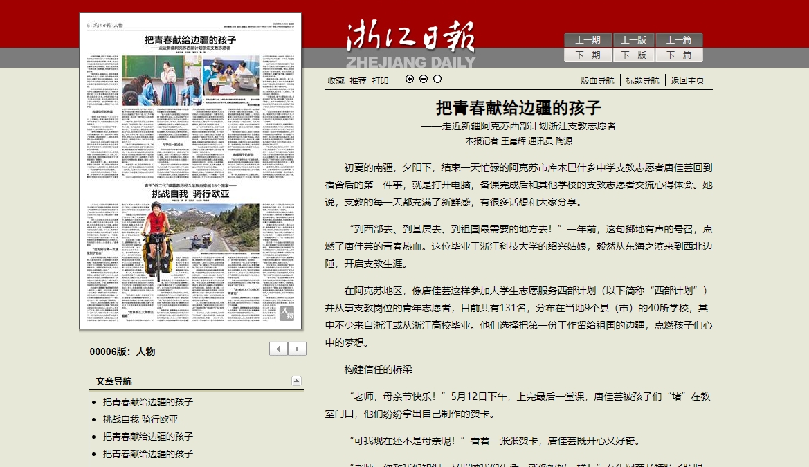 在阿克苏地区,像唐佳芸这样参加大学生志愿服务西部计划(以下简称“西部计划”)并从事支教岗位的青年志愿者,目前共有131名,分布在当地9个县(市)的40所学校,其中不少来自浙江或从浙江高校毕业。他们选择把第一份工作留给祖国的边疆,点燃孩子们心中的梦想。