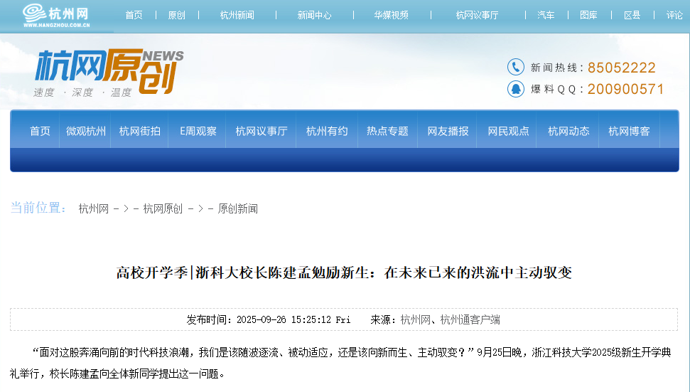 陈建孟建议青年学生于AI时代涵养家国情怀,将“小我”融入“大我”,以科技报国彰显人生价值。他说,作为一所以“科技”命名的大学,以科技创新支撑引领区域经济社会发展,更好服务高水平科技自立自强,是我们的光荣使命,他希望学生能以国家需要领航青春方向,牢记浙科大人的创新使命,在与民族共命运、时代同进步、科技同发展中追梦圆梦、实现价值。