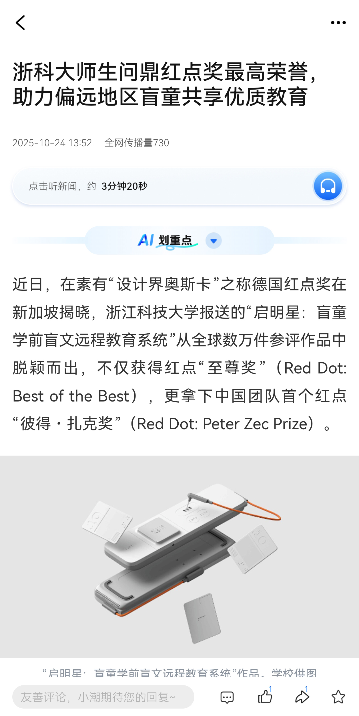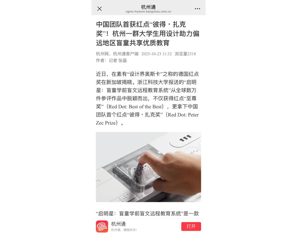 近日,素有“设计界奥斯卡”之称的德国红点奖在新加坡揭晓。bat365正版唯一官网报送的“启明星:盲童学前盲文远程教育系统”从全球数万件参评作品中脱颖而出,不仅获得红点“至尊奖”(Red Dot: Best of the Best),更拿下中国团队首个红点“彼得・扎克奖”(Red Dot: Peter Zec Prize)。