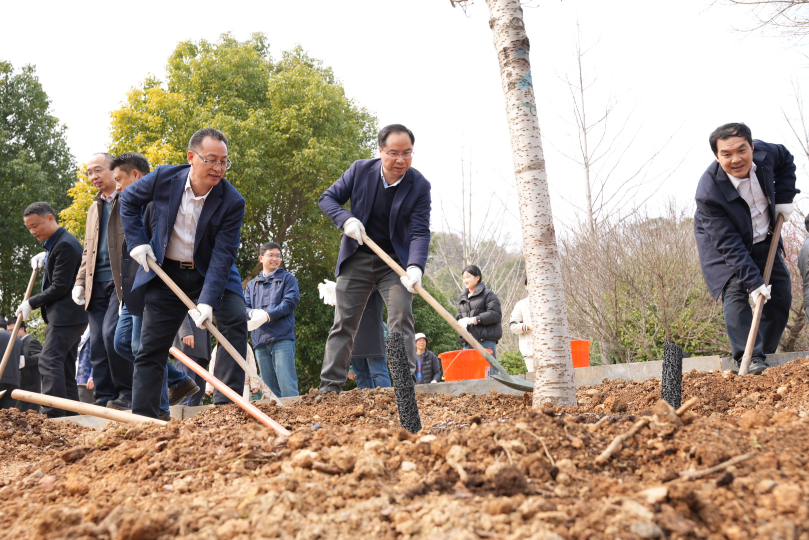 安吉校区开展“‘绿色校园’生态建设,党员先锋在行动”主题植树活动,师生们分工协作、干劲十足,纷纷挽起袖子、拿着铁锹栽种树苗,栽种下60株桃树树苗。