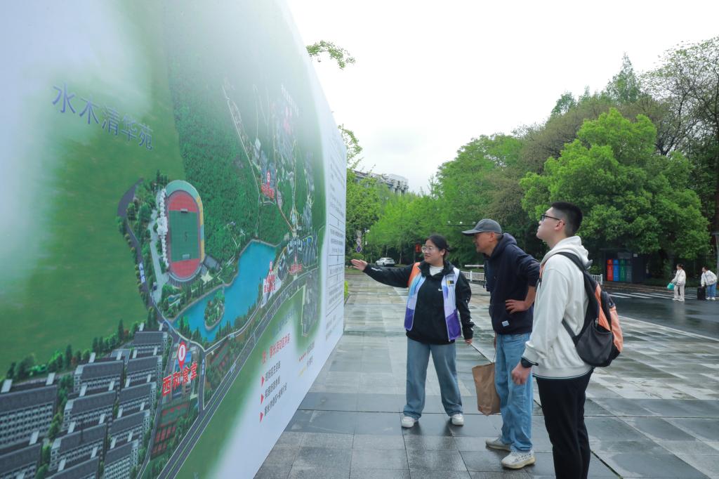 在学校正大门的指引喷绘前,家长和考生仔细阅读着考生须知、家长须知及时间安排。校园里志愿者随处可见,一路为考生们提供相关指引,帮助考生尽快找到考试地点。学校附近的地铁口与考试区域步行约需20分钟,学校特意在地铁口安排了接驳巴士,接送考生和家长。