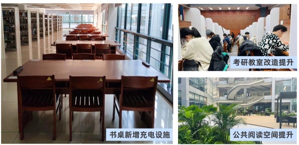 学习环境大为改善。千方百计筹措资金和资源进行条件环境改造。总改造面积超过2500平方米,改造2个考研教室,新增单体式学习空间282个;198张阅览桌安装防干扰隔板;建成研讨室9个;添置沙发68张,建成休闲学习区21个。