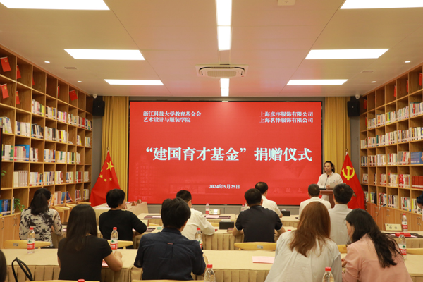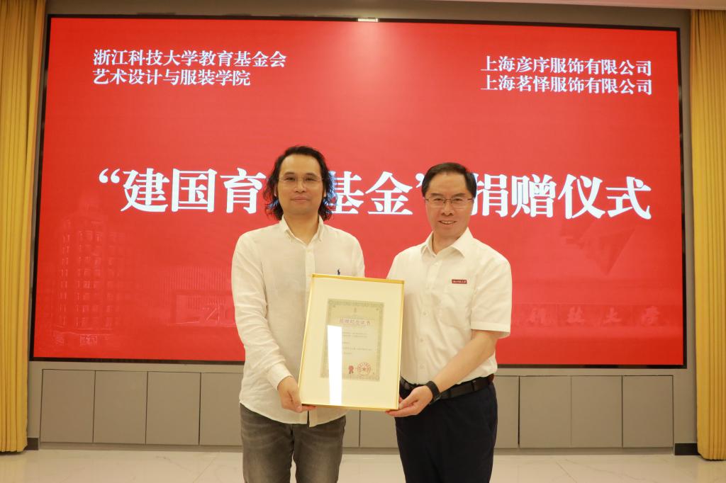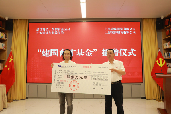 5月25日上午,“建国育才基金”捐赠仪式举行。艺术学院1997级服装艺术设计校友、上海彦序服饰有限公司总经理陈建国向学校捐赠400万元人民币,设立建国育才基金。校党委书记赵东福、校党委副书记张日向出席,学校办公室、党委学工部、校教育基金会、艺术学院负责人和师生代表参加捐赠仪式。