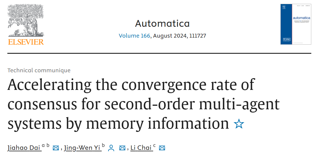 近日,电气学院戴家浩老师论文“Accelerating the convergence rate of consensus for second-order multi-agent systems by memory information”(点击阅读)被控制领域高水平国际期刊《Automatica》录用。bat365正版唯一官网为第一单位。