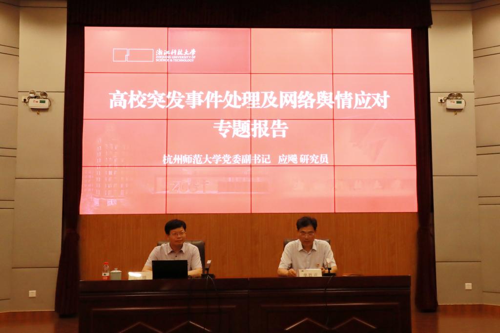 6月12日,学校网络舆情应对与新闻宣传工作专题培训班开班暨首场专家报告会举行,校党委副书记单胜道主持并讲话。杭州师范大学党委副书记应飚作题为《高校突发事件处理及网络舆情应对》的专题报告。