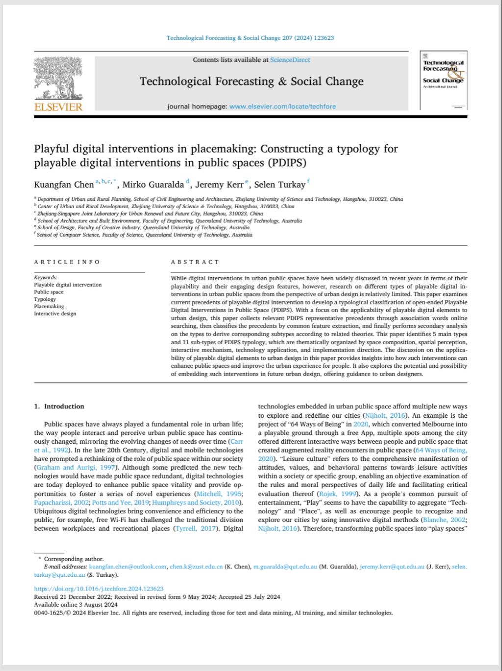 近日,土木与建筑工程学院城乡发展研究中心陈旷帆博士以第一作者兼通讯作者身份在区域与城市规划领域、创新管理领域高水平期刊《Technological Forecasting and Social Change》发表题为“Playful digital interventions in placemaking: Constructing a typology for playable digital interventions in public spaces (PDIPS)”(点击阅读)的研究论文。