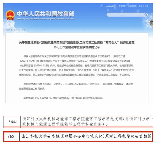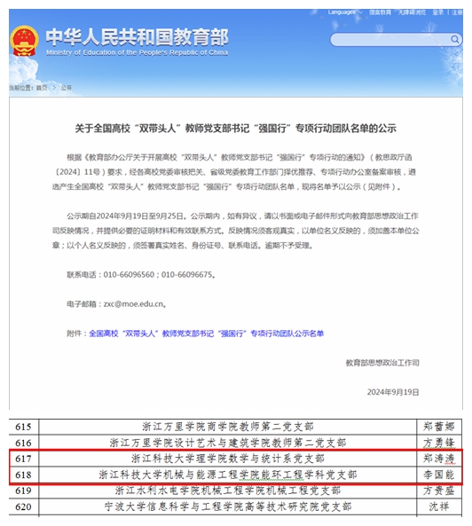 近日,教育部思想政治工作司公布了全国高校“双带头人”教师党支部书记“强国行”专项行动团队名单和第三批“全国党建工作样板支部”建设单位验收通过名单,bat365机能学院能环工程学科党支部、理学院数学与统计系党支部入选“强国行”专项行动团队;机能学院能环工程学科党支部、安吉校区后勤事务中心党支部通过“全国党建工作样板支部”验收。