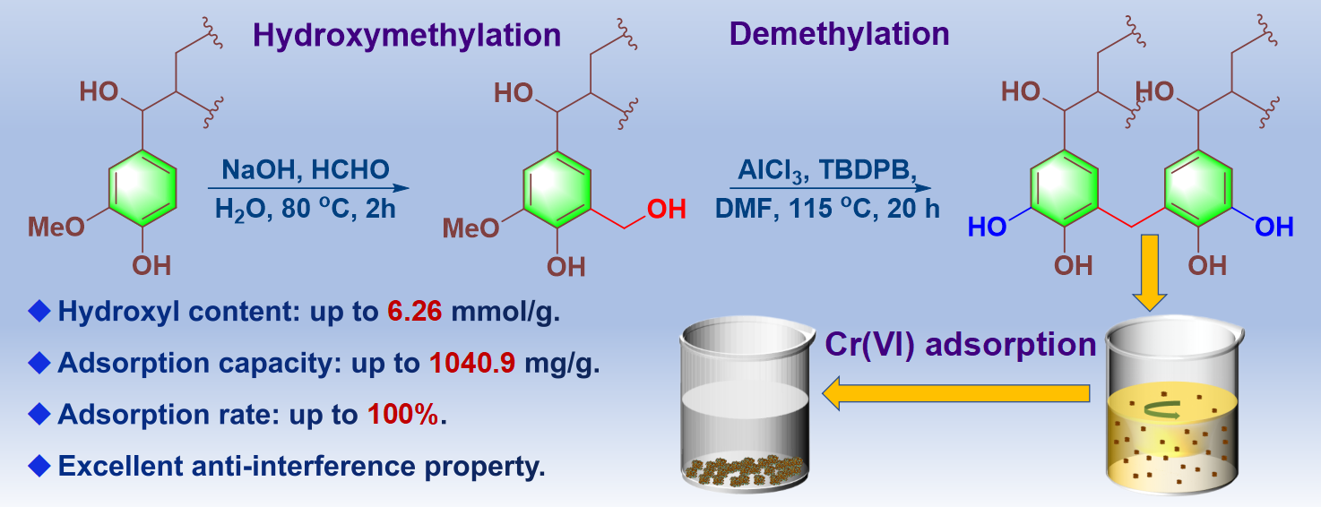 电镀、皮革加工以及采矿等行业排放的大量Cr(VI)离子会导致严重的水体污染,进而对水生生物乃至人类健康构成威胁。现有处理方法中,吸附法因操作简单、可处理低浓废水等优点脱颖而出,但仍面临成本高、吸附效果差和二次污染等诸多难题。与此同时,木质素作为全球第二大生物质资源,年产量巨大,但其高值化利用率不足5%,资源浪费严重。该研究通过羟甲基化-脱甲基化串联反应调控木质素分子结构的方法构建了一种高效木质素基Cr(VI)离子吸附剂,并分析了木质素分子结构与其吸附效果间的构效关系。该吸附剂的木质素含量超过85%,吸附量可高达1040.9 mg/g,远超同类型吸附剂,实现了高木质素含量和优异吸附效果的有机统一,且在同时含有多种离子的复杂废水体系中仍能对Cr(VI)离子保持91%的吸附效果,显示出巨大的实际应用潜力。