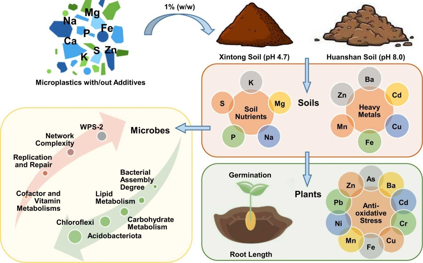 微塑料作为地球关键带中的一种新兴污染物,长期存在于土壤生态系统,并协同重金属污染物一起迁移运输,严重威胁农业生产。当前关于不同土壤类型中微塑料与重金属之间复杂交互作用,对土壤微生物功能和作物生长影响的系统性研究非常缺乏。该研究通过在不同类型土壤中添加多种微塑料,深入探究微塑料及重金属污染物对土壤-微生物-植物系统的综合影响,结合土壤理化生化、植物生理和微生物生信分析构建结构方程模型,厘清土壤功能和健康指标的响应性变化,深入评估微塑料污染对作物生产和土壤健康的潜在威胁,为相应政策的制定和农业可持续生产提供理论支持。