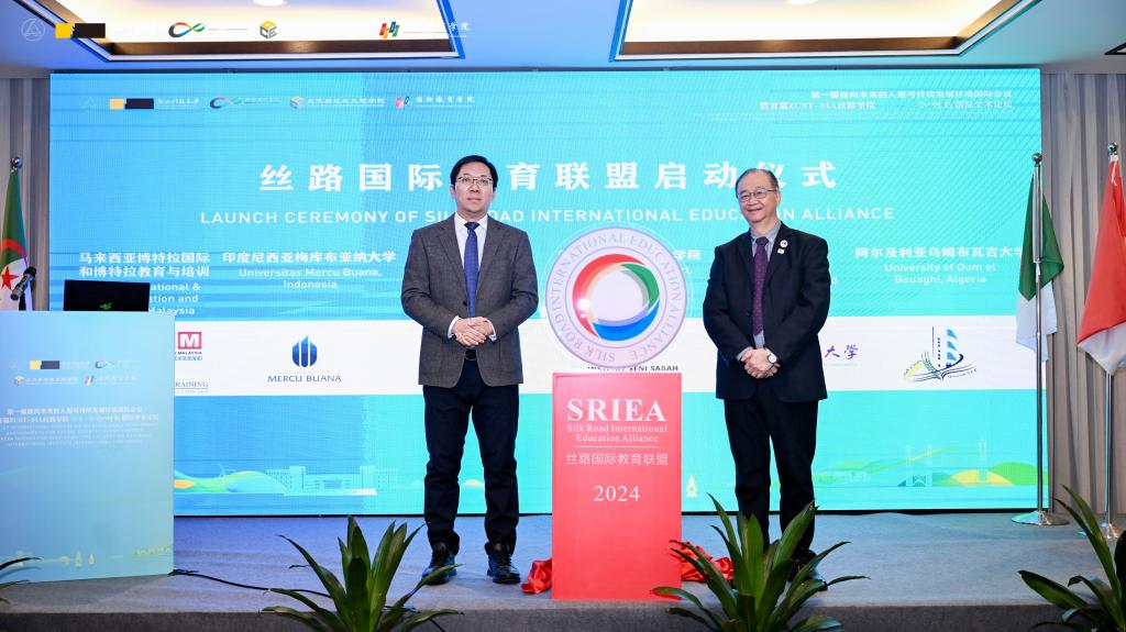 开幕式上,丝路国际教育联盟正式成立,来自中国、马来西亚、印度尼西亚、泰国、阿尔及利亚等国家的高校和教育集团加入丝路国际教育联盟,开启一带一路沿线国家国际教育合作新篇章。印度尼西亚梅库布亚纳大学校长Andi Adriansyah、阿尔及利亚乌姆布瓦吉大学副校长Lamamra Kheireddine教授、泰国博仁大学创新技术与工程学院院长Chaiyaporn Khemapatpapan、马来西亚博特拉大学国际负责人Mr. Mohammad Zamaillah Bin Ahmad等丝路国际教育联盟成员先后发言。